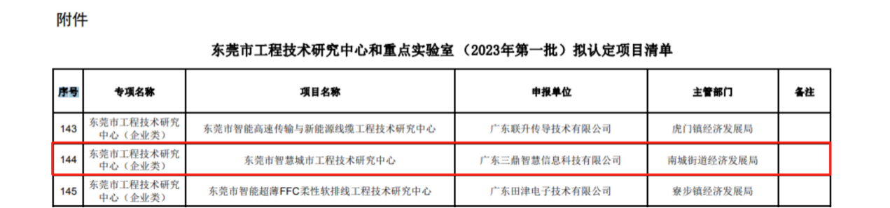 近日,东莞市科学技术局发布了《关于东莞市工程技术研究中心和重点实验室(2023年度第一批)拟认定项目的公示》(项目已过公示期),其中,由广东三鼎组建的“东莞市智慧城市工程技术研究中心”顺利通过认定。